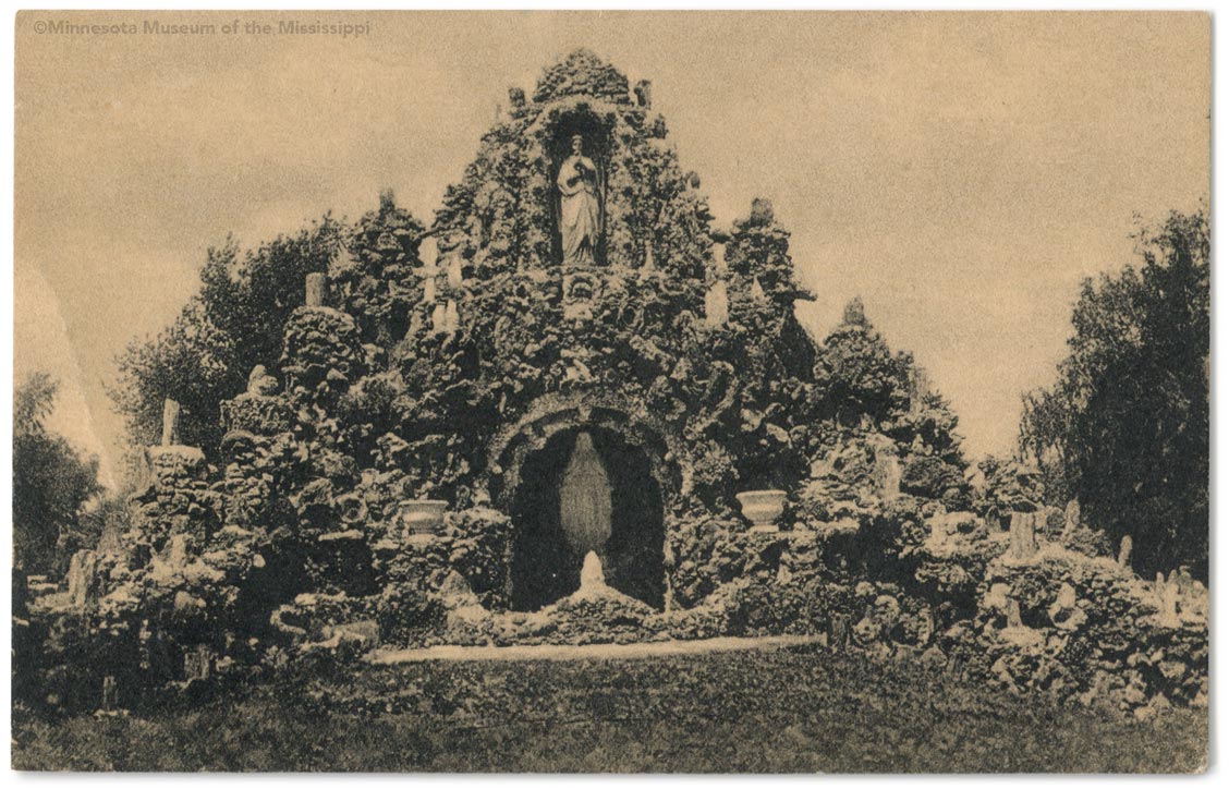 The grotto is a roughly symmetrical mountain with outstretched limbs. The rock walls were made from rugged limestone gathered from the river bluffs near LaCrosse, Wisconsin, encrusted with stalactites, geodes, petrified wood and rare crystals. A narrow, winding staircase leads up to a small viewing platform enclosed by railings with mosaic panels encrusted with copper ore, amethyst and rose quartz.