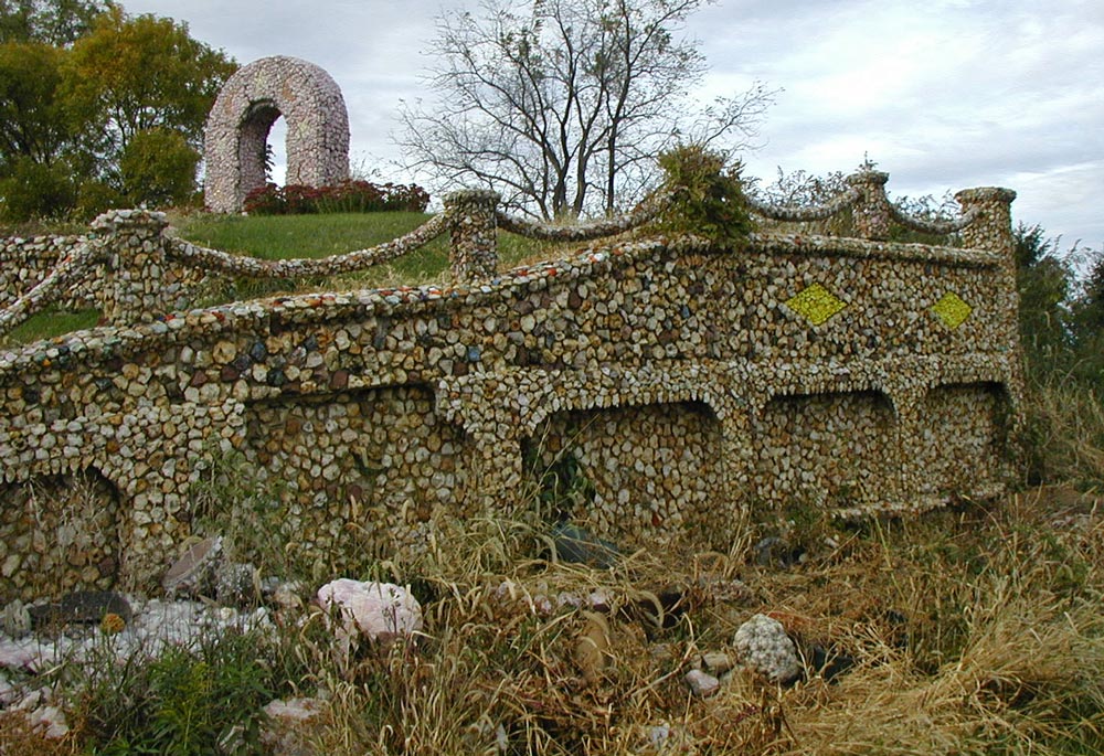 A sturdy rainbow arch decorated with moons and stars crowns the hill. The plain decoration and proportions are quite similar to an arched gateway at Rockome Gardens. Could one have inspired the other? This arch is encrusted with pink quartz and decorated with moons and stars.